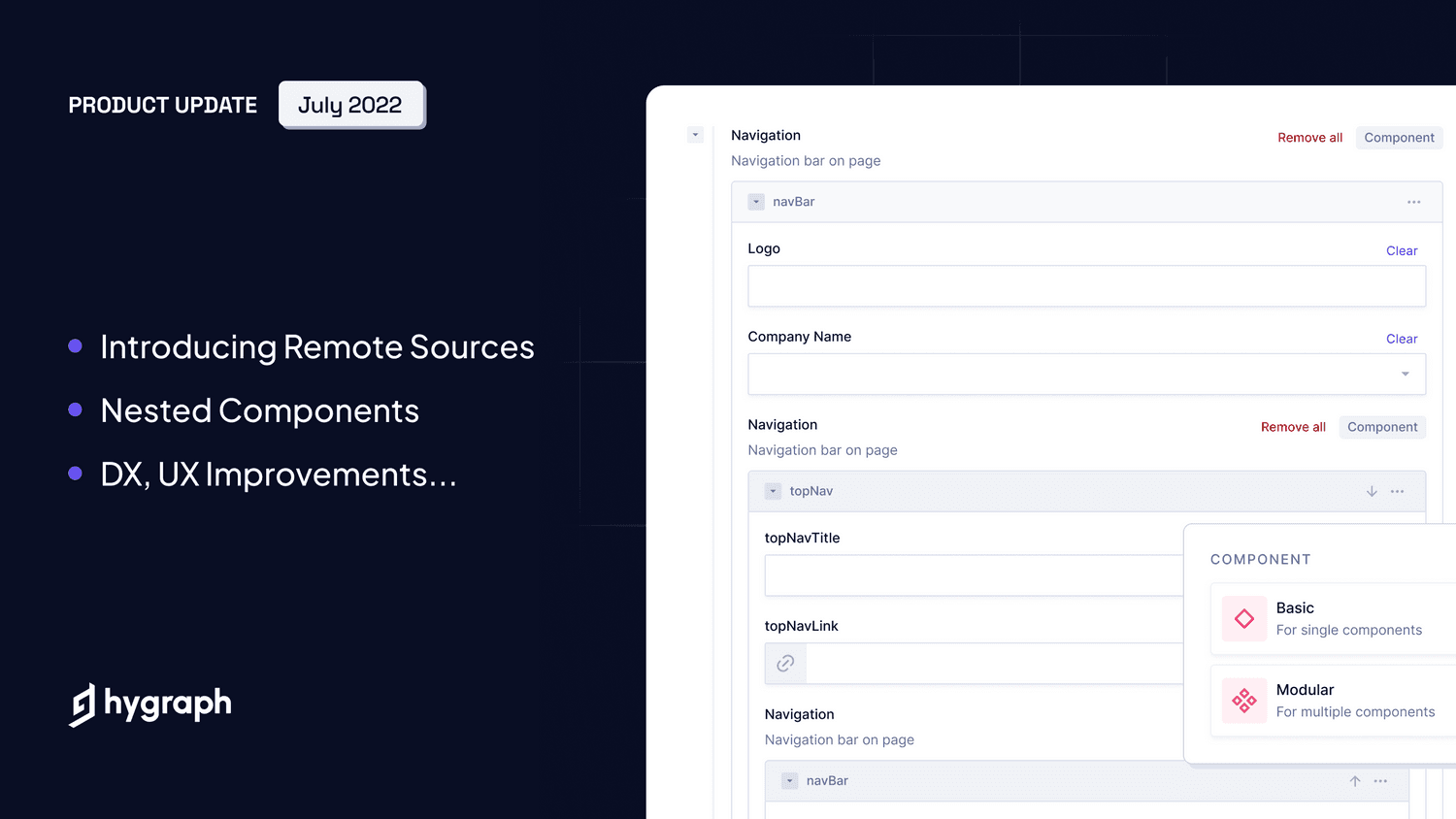 A Remote Source is any system or product that holds content or data that should be combined with content in Hygraph into a single API, while a Remote Field refers to a field inside a Hygraph model that connects specific remote data to an entry of that model. With our unique low-code approach to federation, you can combine data from any RESTful or GraphQL API with content stored in Hygraph through our easy use UI. Our caching infrastructure ensures amazing performance for the resulting federated API.