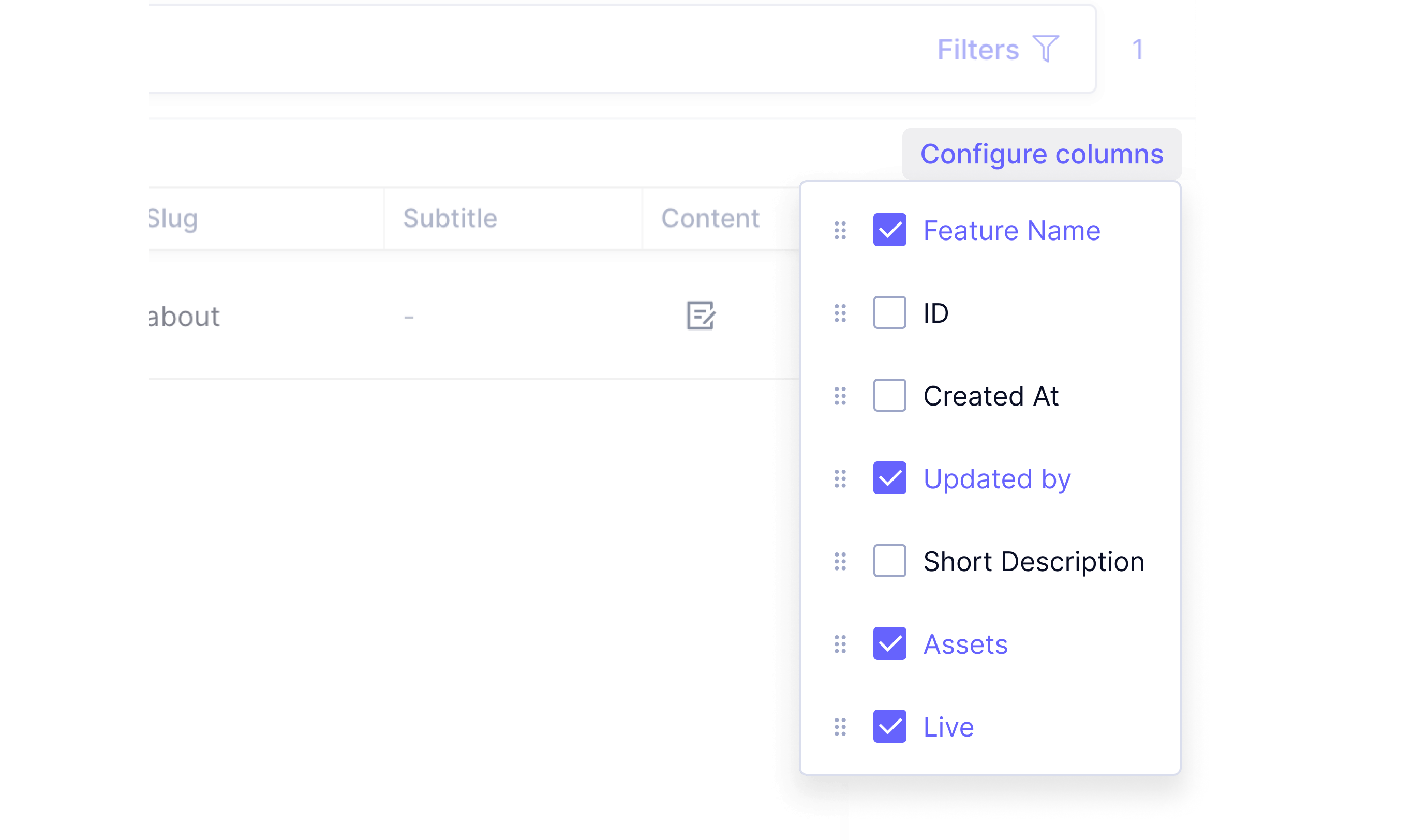 You can show or hide different columns and filter which content should be included in the group. This allows for an optimized editorial workflow, helping editors to quickly find the content that needs their attention.