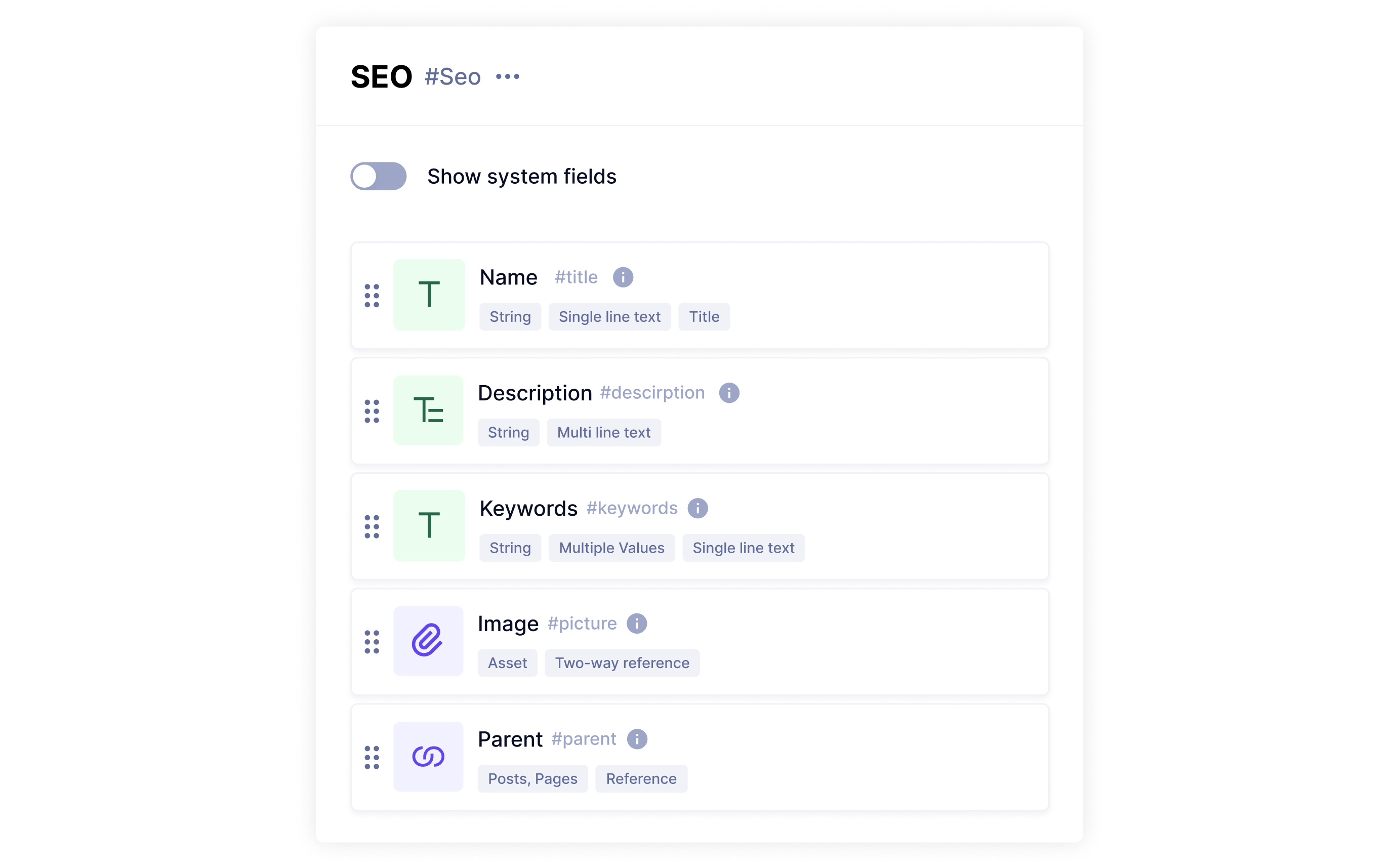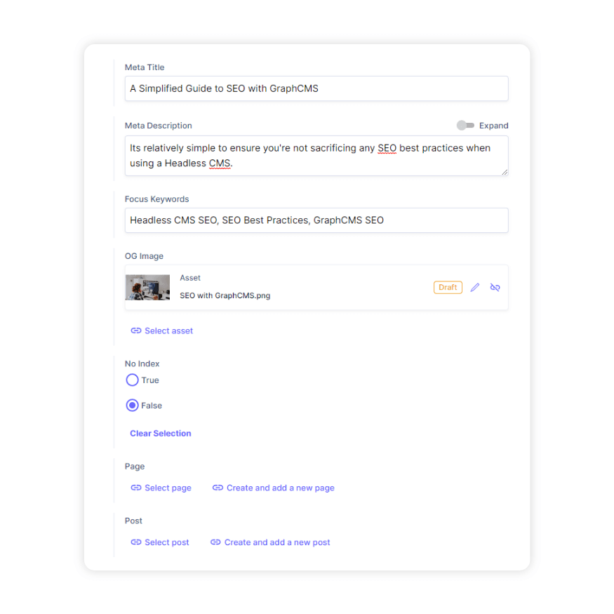 Since the concept of simple plug-and-play plugins like Yoast don't exist in the Headless world, we opted to run our operational SEO as a model within Hygraph. All the required fields are set as an SEO model, which can have relations to a variety of pages, posts, and resources.