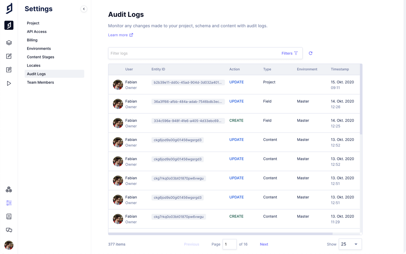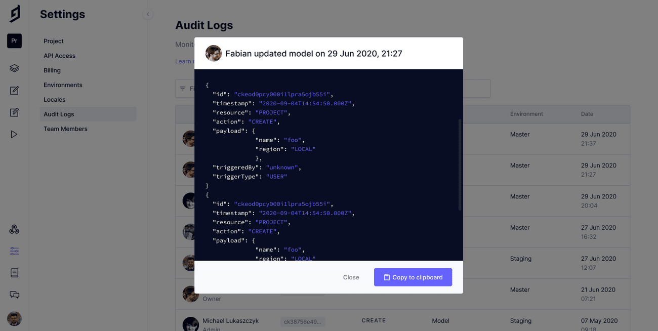 Monitor any changes made to your project, schema and content through detailed audit logs.